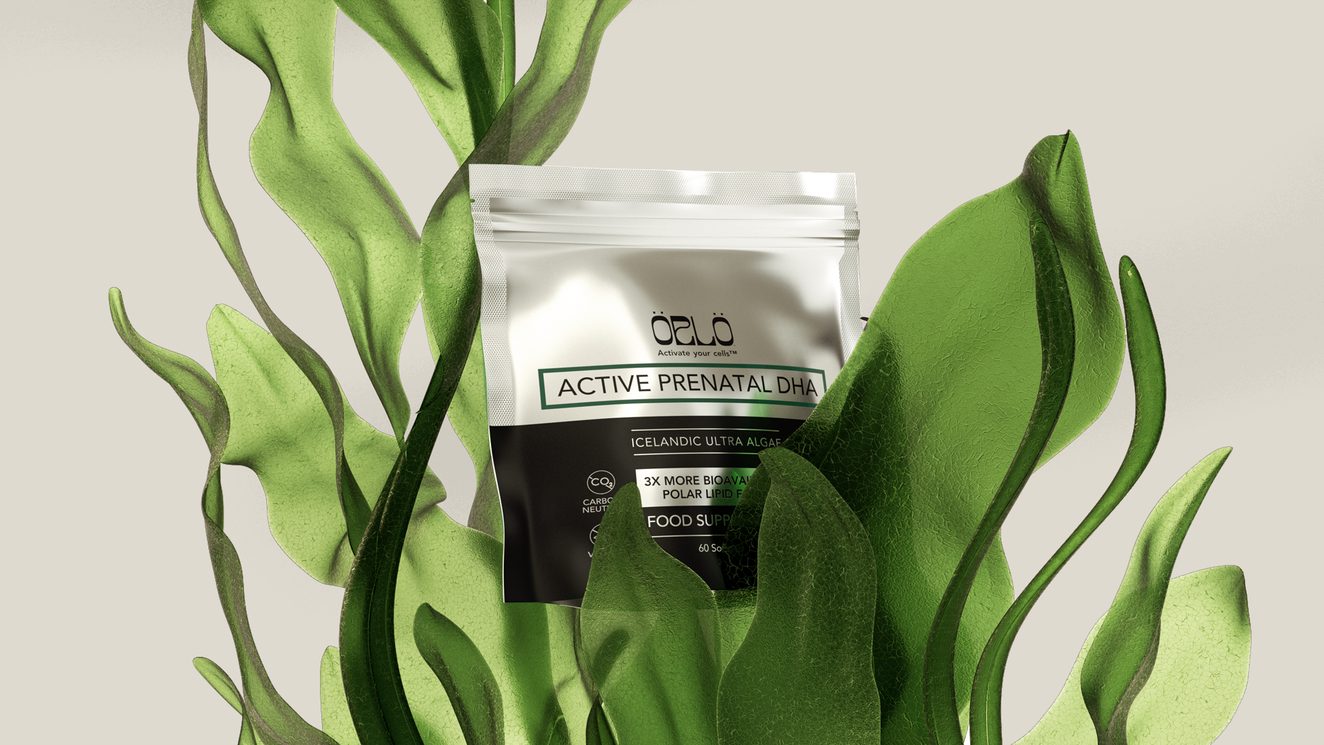 ÖRLÖ DHA kemur í pakkningum úr endurunnum pappa eða bólstruðu umslagi, sem prentað er á með kolefnisneikvæðu þörungableki.